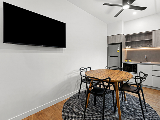 Enjoy self-catering convenience with a well-equipped kitchen featuring a fridge, microwave, kettle, and toaster. A dining area to hang out and enjoy your meals.